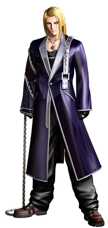 His main appearance has him wearing a long purple trenchcoat with a silver collar and a matching silver design which secures his chains. Underneath are black denim overalls with a red cross design at the back and brown shoes with dark brown straps in the middle. He also has a necklace with a silver round pendant that contains a picture of Dominique Cross and wears a pair of black gloves.