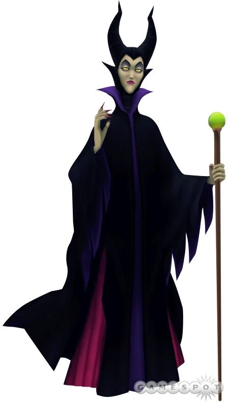 Maleficent [1]is a sorceress of awesome power. She leads the villains who seek to harness the power of darkness, urging them to be careful not to let it overwhelm them. However, unbeknownst to her, the Heartless she believes she controls are actually using her. Xehanort's Heartless unlocks her heart and turns her into her dragon form. Sora defeats and kills her but she is resurrected in Kingdom Hearts II, where she seeks a new base of operations so she can resume her intent to obtain Kingdom Hearts. At first she wants to get back at Sora, but she ends up helping him on two occasions.